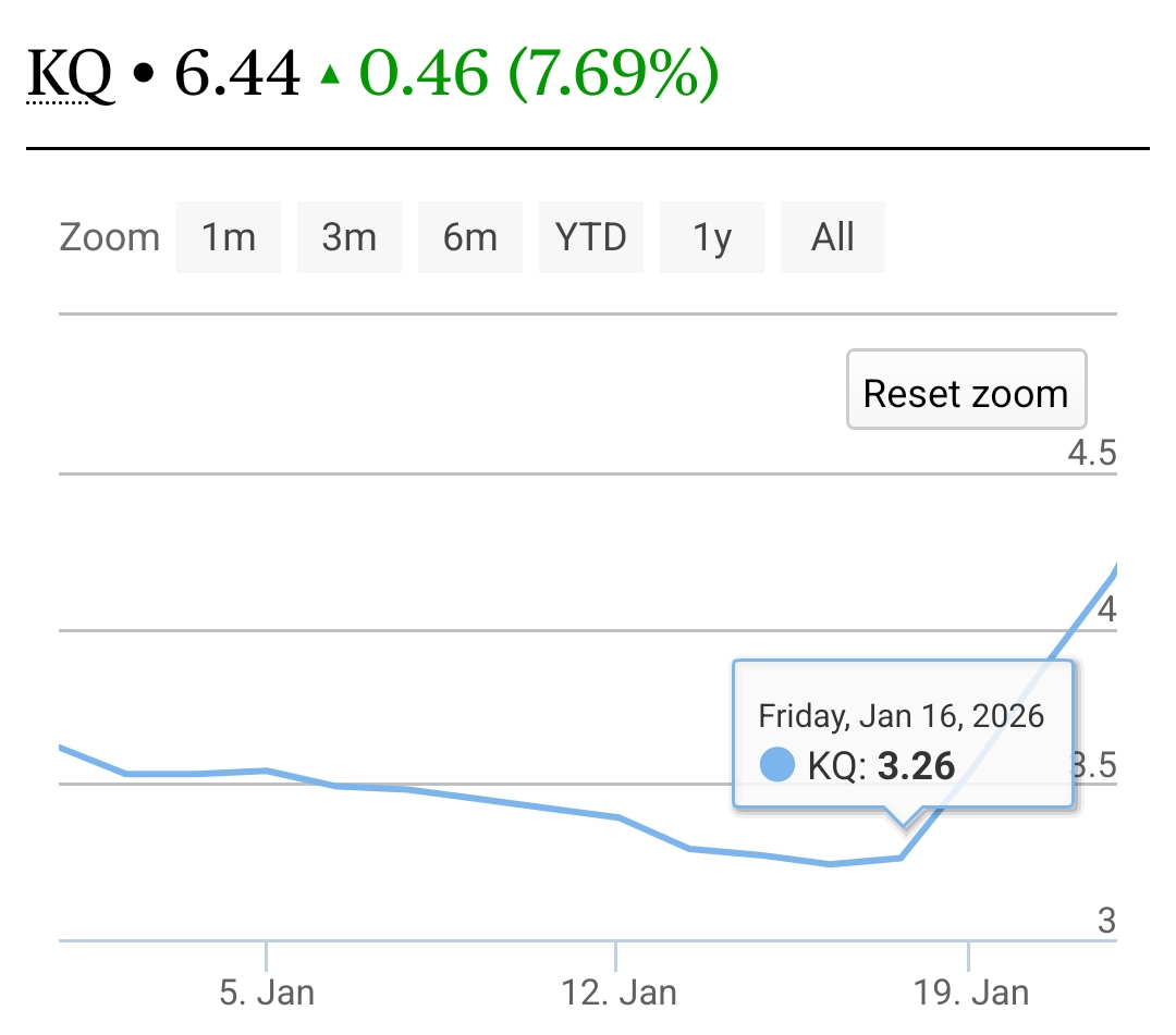 1. KQ. NBV KES (31.16). (Start Price: Ksh 3.30; Current Price KES 6.00. Target/ONO Exit Price range Ksh 8.52 by Dec 31st 2026); About 150% Upside