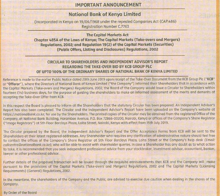 Following the earlier Public Notice dated 6 May 2019 upon receipt of the Offeror’s Statement from the KCB Group Plc (“KCB” or “Offeror”), the Directors of National Bank of Kenya Limited (“the Company”) were, on 19th June 2019 served by KCB with the Take-Over Document to acquire a hundred percent (100%) of the ordinary shares of the Company upon re-designation of the Preference Shares into ordinary shares (“Offer Shares”) (“Proposed Transaction”).