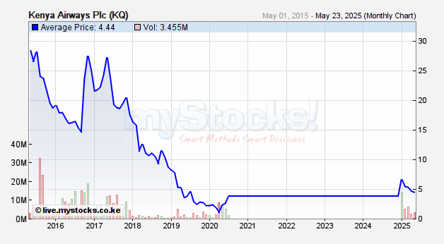 cyruskulei wrote:There is nothing called long term in NSE. Just note KQ in a span of 10years: from 200.00 to 2bob. Wonders never cease.  If you bought shares worth 1 million 10 years ago and went into a comma, you'd wake up today to a portfolio worth 10,000/=