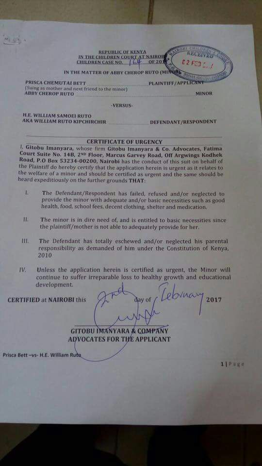 Chemutai indicated in her court documents that she met Ruto in 2005 while studying at Moi University. She said her child was born on March 6, 2006 at Mediheal Hospital.